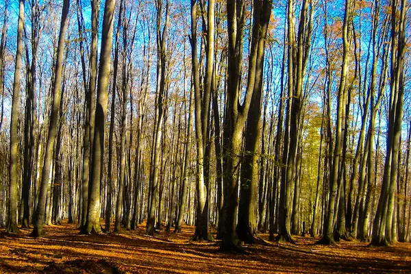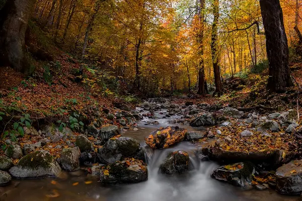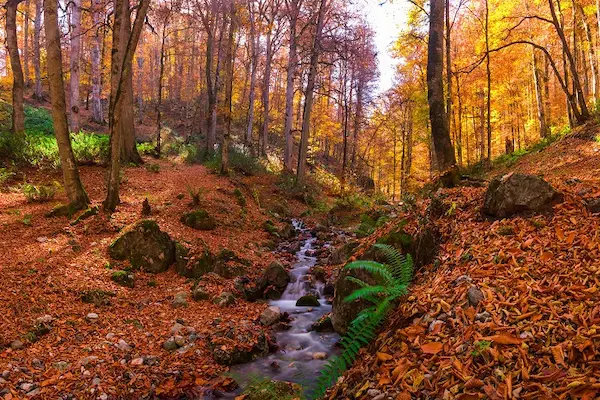 مسیر کوهستانی و جنگلی با درختان راش که در پاییز منظره ای کارت پستالی از رنگ های زرد و نارنجی و قهوه ای خلق میکنند.جنگل نوری در سایه ی خنک برگ ها و صدای آرامبخش رودخانه